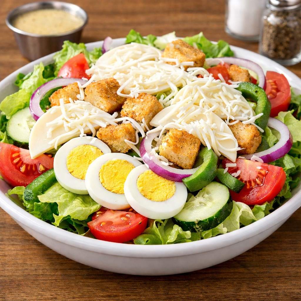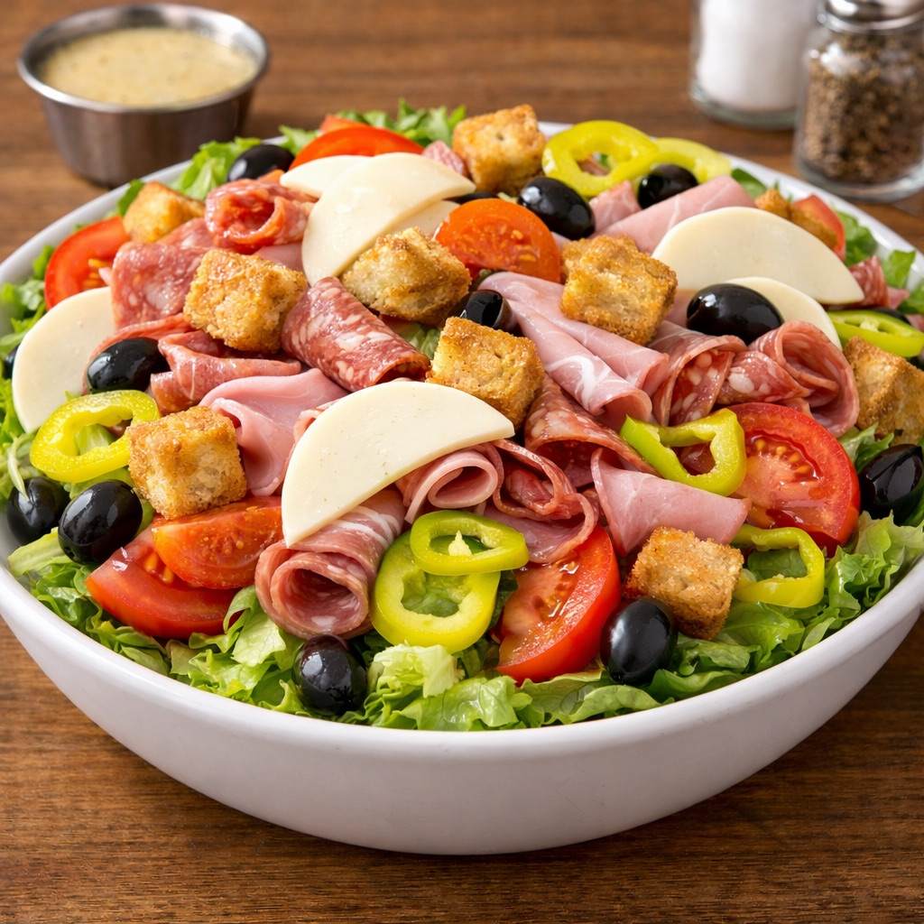 Salami, capicola, ham, pepperoni, lettuce, tomato, banana pepper, black olives, croutons, cheese.