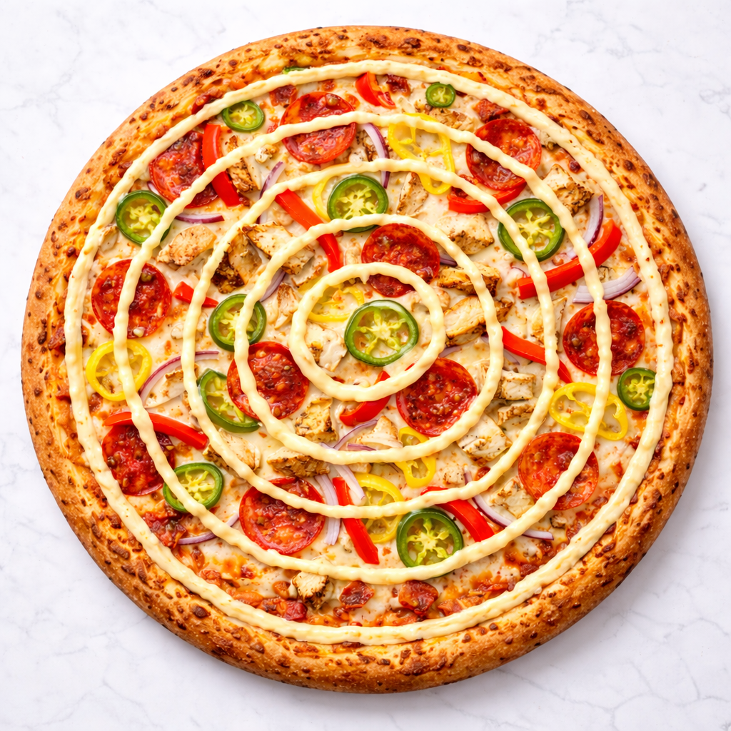 Arizona Ranch Base, Pizza Cheese, Grilled Chicken, Roasted Red Peppers, Jalapenos, Banana Peppers, Onions, and Pepperoni
